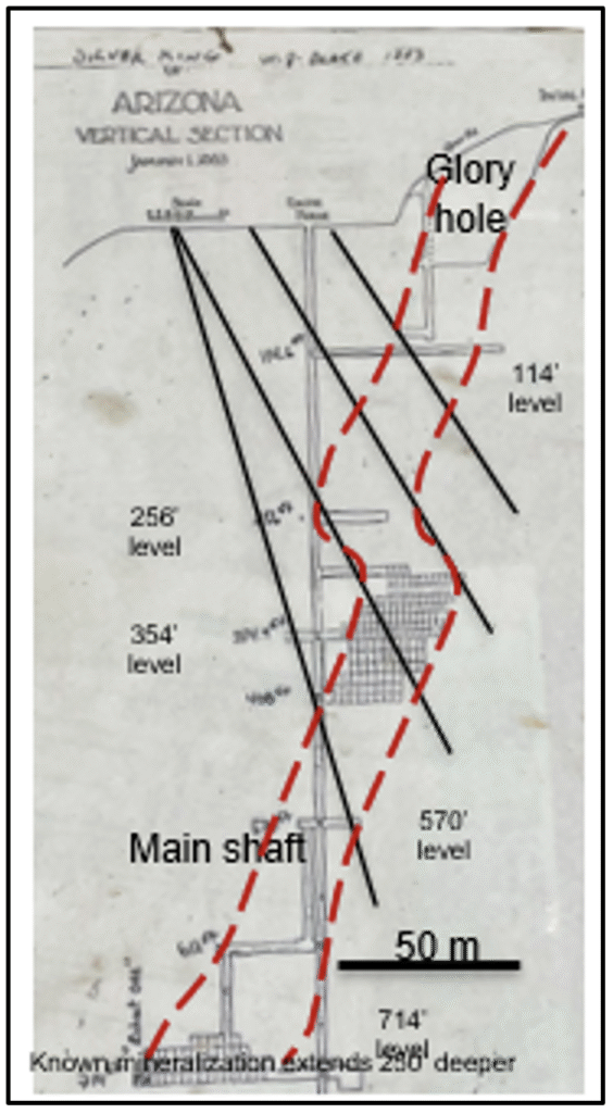 Figure 2. Cross section through the Silver King mine workings showing proposed drill holes (in black) to test the pipelike mineralized body (in red)