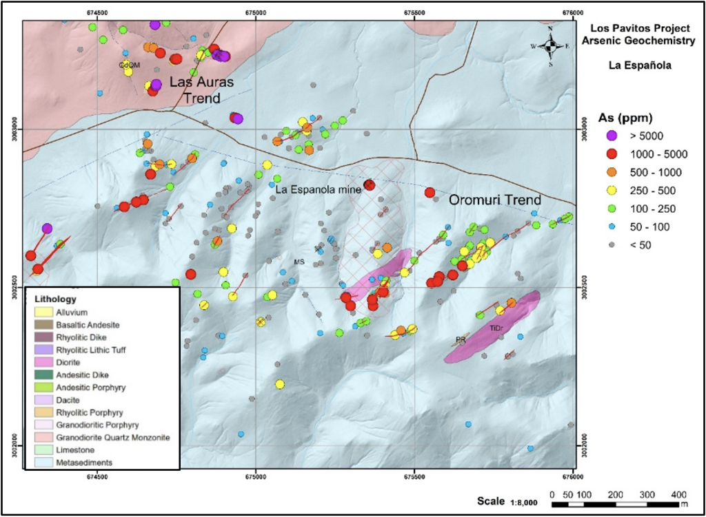 Figure 2. Arsenic geochemistry in the Oromuri trend of the Los Pavitos project.