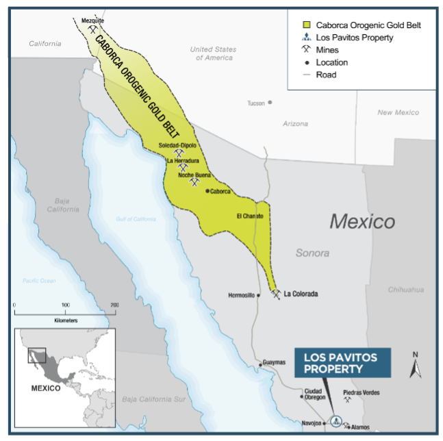 Location of the Los Pavitos project in southern Sonora State in relation to the Caborca Orogenic Gold Belt.