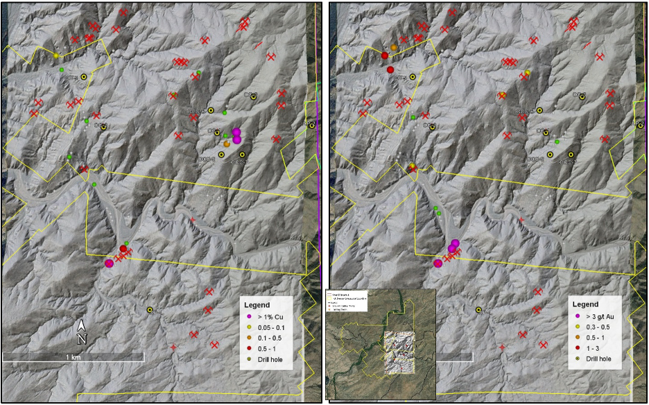 Figure 1. Copper (left) and Gold (right) plotted on preliminary LiDAR interpretation with small mines and prospects and historic drill holes.  The inset shows the location of the figure in the land package.