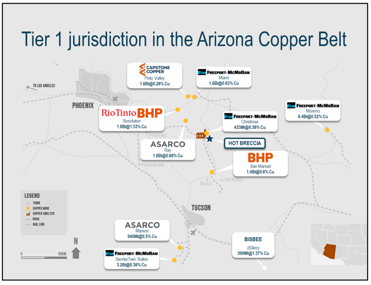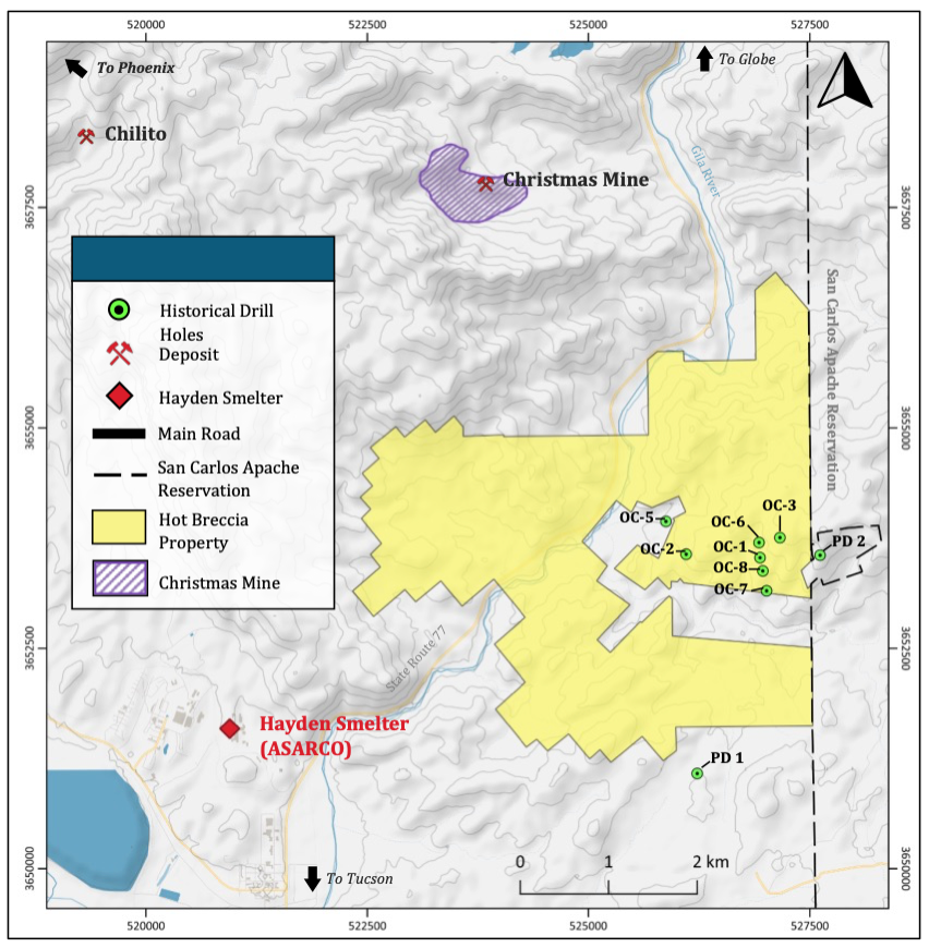 The Hot Breccia property consists of 1,420 hectares of contiguous mining claims located in the world class Arizona Copper Belt.