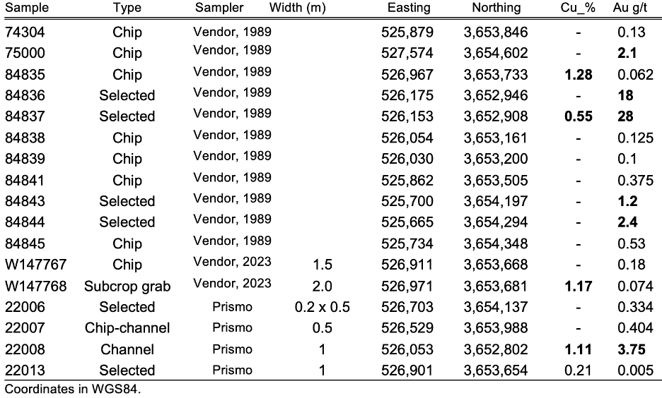 Rock samples taken by Prismo were analyzed by multielement ICP-AES and MS methods by ALS Group, an internationally recognized analytical service provider.  Gold was analyzed by fire assay using a 25-gram charge, with an AA finish.  Cu over 1% by an overrange method.  Certified Reference Materials including standard pulps and coarse blank material were inserted in the sample stream at regular intervals.  Samples taken by the vendor in 2023 were also analyzed by ALS Group.  Samples taken by the vendor in 1989 were analyzed by Skyline Labs, certificates and QAQC data are not available, and these data should not be relied upon, and are used solely as a guide to exploration.