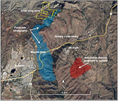 The Silver King deposit is located three kilometers from the Resolution Copper deposit and the high-grade Magma mine, a former copper and silver producer, located 0.6 to 1.5 kilometers to the southwest Mineralization at Silver King is hosted by the same rock sequence that hosts those two deposits but is exposed at surface and is not covered by the thick sequence of unmineralized volcanic rocks that covers Resolution Copper. From 1911 to 1996 the Magma mine was developed on veins and replacement deposits in the Paleozoic and Precambrian strata and intrusive rocks, producing approximately 27.6 million short tons of ore averaging about 4.9% copper with important quantities of zinc, gold (689K oz) and silver (34.3M oz) (Briggs, 2015), eventually leading to the discovery of the nearby Resolution copper deposit (Fig. 1).