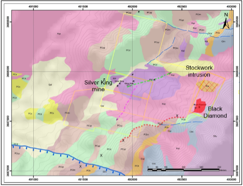 “The exploration work has resulted in the identification of several mineralized occurrences on the property, including veins in the vicinity of the Silver King mine, and replacement and skarn mineralization in limestone units of the sedimentary sequence near the contact.”