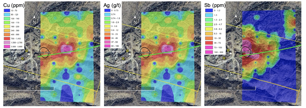 Figure 3. Soil geochemistry maps for Cu, Ag, and Sb from the Silver King mine. Contours are from values measured in soils by a handheld XRF in the field, with ranges for Cu at 5,619 ppm to 12.5 ppm, Ag at 186 ppm to 1.3 ppm, and Sb at 300 ppm to 3.9 ppm.