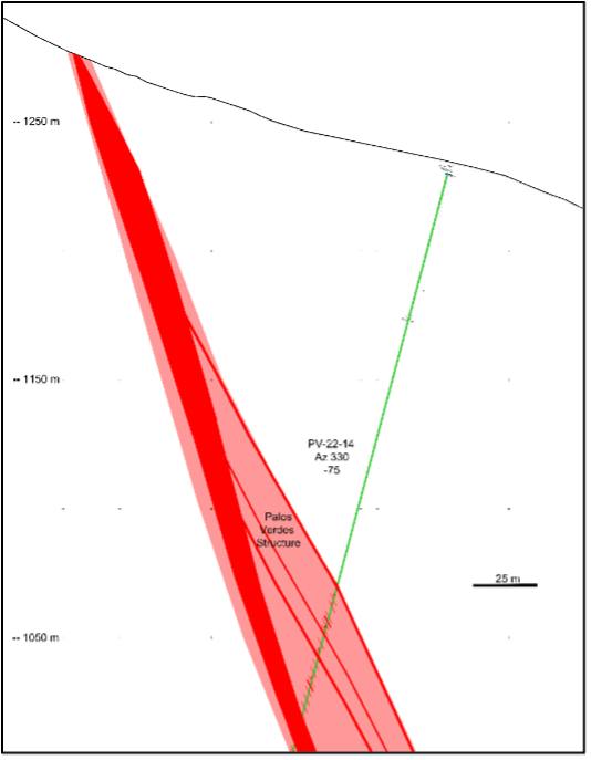 - Wide structural zones are being intersected at depth where the Palos Verdes vein is branching into several strands measuring from about 0.5 meters to nine meters in width, separated by andesite wall rock cut by narrow veins and veinlets, in contrast to a large discrete quartz vein near the surface.