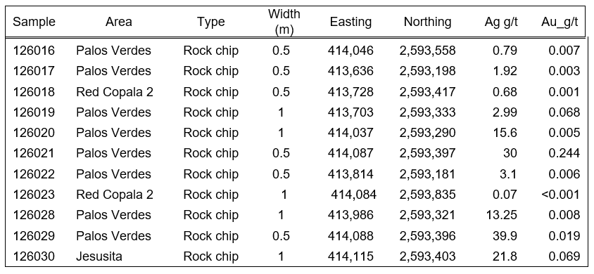 The Company recently completed a mapping and sampling program in the eastern portion of the Palos Verdes concession to better define the orientation of the main vein as well as several subsidiary structures that were previously recognized.  Eight samples were taken on the Palos Verdes concession and several others were taken on adjacent concessions, yielding anomalous precious metals values of as much as 39.9 g/t Ag and 0.244 g/t Au in the area to be drilled initially (Table 1, Fig. 2).