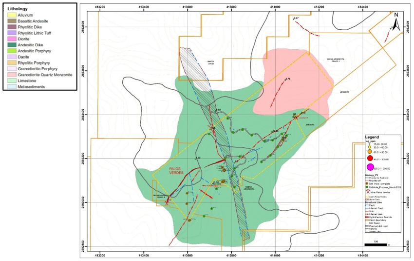 The Palos Verdes vein originates on Vizsla’s concession to the south-west of the Palos Verdes concession and has 750 meter of strike length on Prismo’s ground (Fig. 1).
