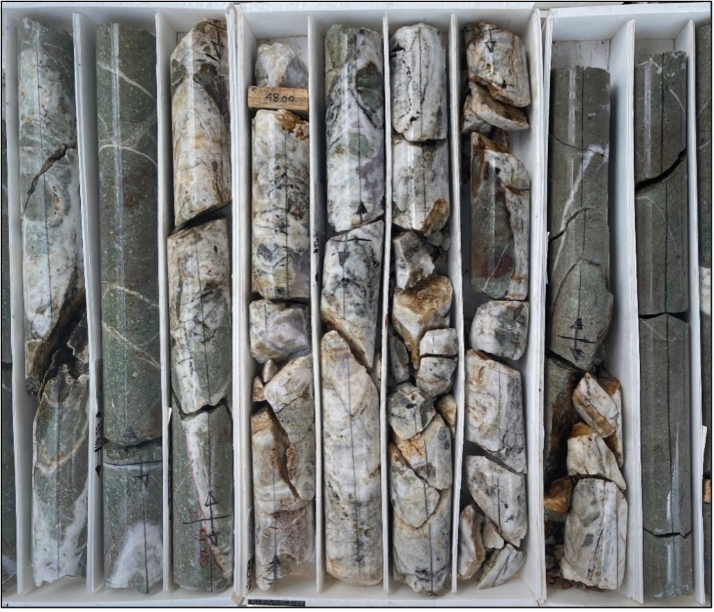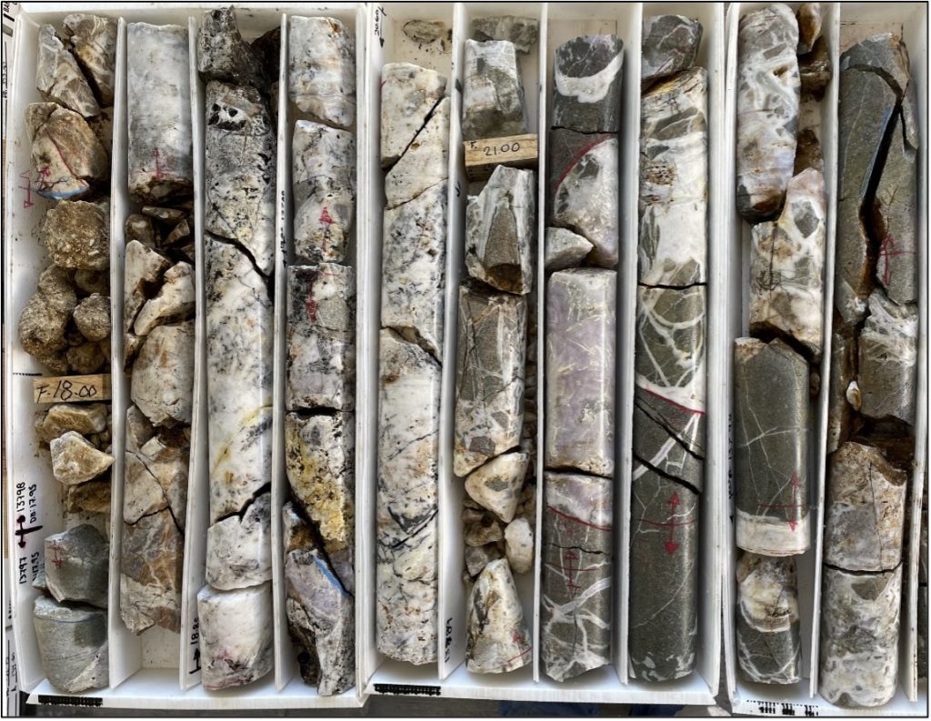 Five holes have been completed for a total of 727 meters of HQ core drilled for the current program. Samples from the first three holes have been submitted to the lab for analysis. Drilling so far has been completed in the northeastern limit of the Palos Verdes vein system exposed on the Palos Verdes concession. Results confirm the presence of multiple narrow quartz veins along the structural trend as expected based on surface mapping and sampling (see photos below). Surface sampling undertaken in the region to help define the drill pattern yielded high grades from one of these veins that returned an assay of 840.5 AgEq (700 g/t Ag and 1.68 g/t Au) over a width of 1 meter.