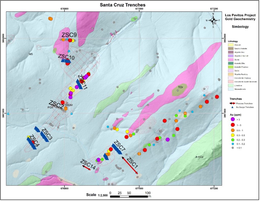 The Company is also pleased to announce that its trenching program across the main mineralized trends on its Los Pavitos property is well underway, and that 295 meters of trenches have been constructed and sampled. The main objective of the trenching program is to better define the orientation and full width of the mineralized structures prior to starting the drill campaign. Assay results have been received for 44 samples from the first three trenches in the Santa Cruz area with a combined length of 96.7 meters, along with an additional 233 samples from the ongoing mapping and sampling program. Of note are an interval of 10m with a weighted average of 0.44 g/t Au in trench ZSC9, and a new silver rich target area with multiple samples assaying more than 300 g/t Ag over 1-2 meter widths and ranging to as much as 579 g/t Ag. An additional 127 trench samples have been submitted to the assay lab with results expected in two weeks. The 5289 hectare (20 square miles) Los Pavitos project is located in the well mineralized Alamos region of southern Sonora State, Mexico