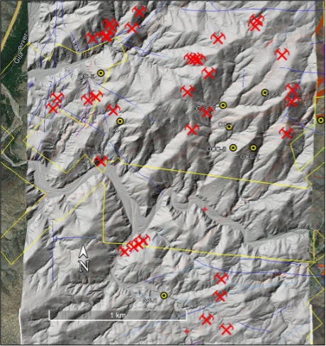 Figure HB1. Preliminary LiDAR interpretation with small mines and prospects and historic drill holes.