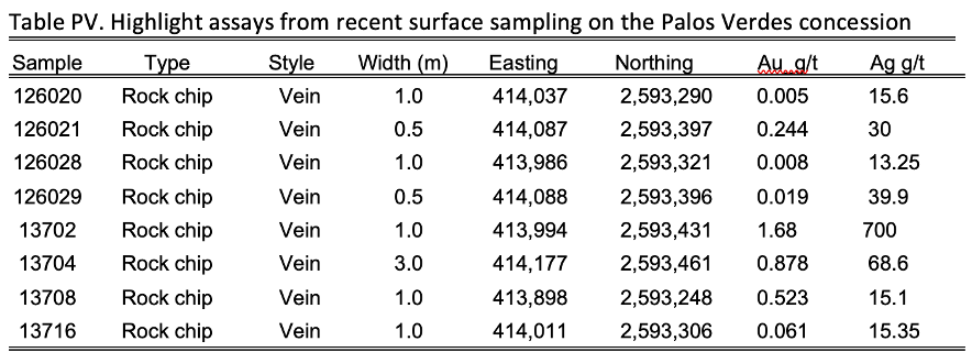 For Palos Verdes, silver equivalent values are calculated using the following metals prices: Au, US$1,750/oz, Ag, $21.24/oz, Pb, $0.97/lb and Zn, $1.34/lb. Cu was not used in the calculation, and metallurgical recoveries were not considered as there is no data available.