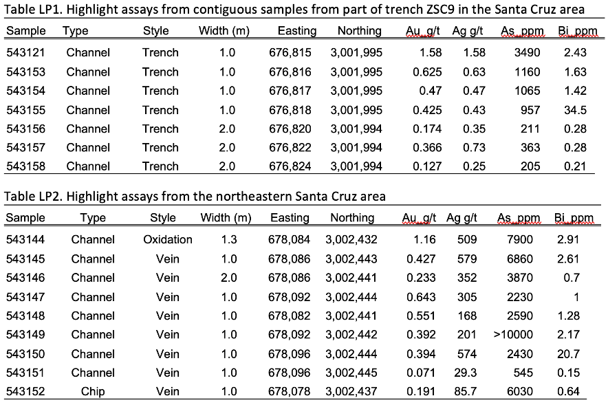 Figure LP1. Trench location and gold assays in the Santa Cruz area.