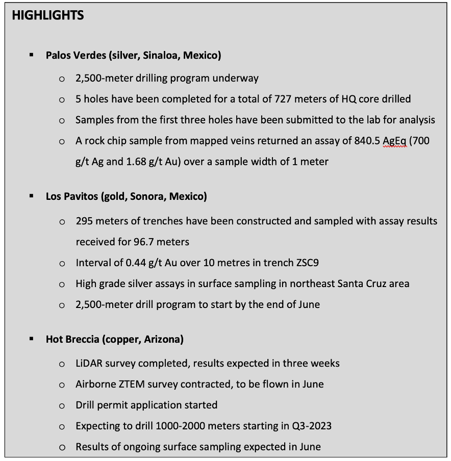 Dr. Craig Gibson, President and CEO commented: “Prismo is in the very enviable position of having three fully funded drilling campaigns this year, thanks to our strong liquidity position. Drilling is currently underway at our Palos Verdes silver project, drilling will commence shortly at our Los Pavitos gold project and we expect to be drilling our Hot Breccia copper project in the third quarter.”