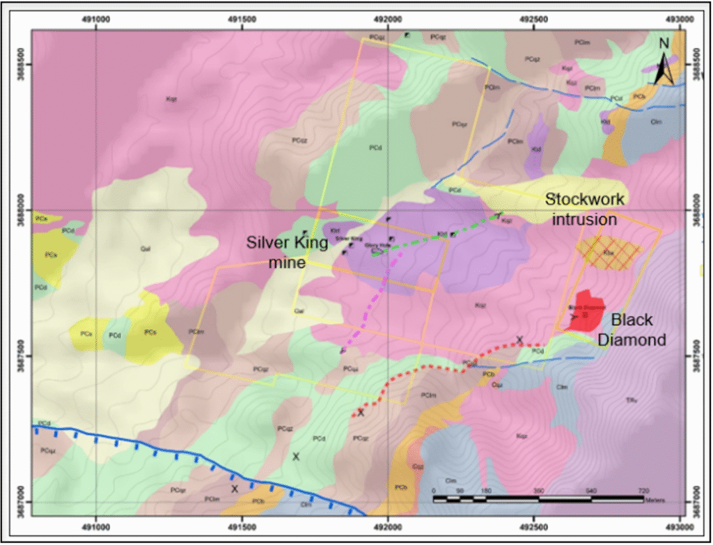 Figure 1. Geologic and land map of the Silver King project showing newly described polymetallic vein in magenta (Ag-Pb-Zn), copper vein in green (Cu-Ag) and stratigraphically controlled replacement mineralization in red. The strongly altered intrusion with stock work quartz-pyrite veining is indicated by the crosshatch.