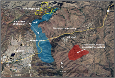 Figure 3. Map showing Silver King project and nearby mineral deposits. The Silver King deposit is located three kilometers from the Resolution Copper deposit (a joint venture between Rio Tinto and BHP) and the high-grade Magma mine, a former copper and silver producer.