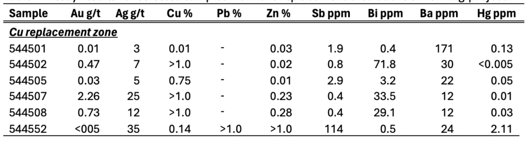 Table 2. Assay results for selected samples from the replacement area at the Silver King project.