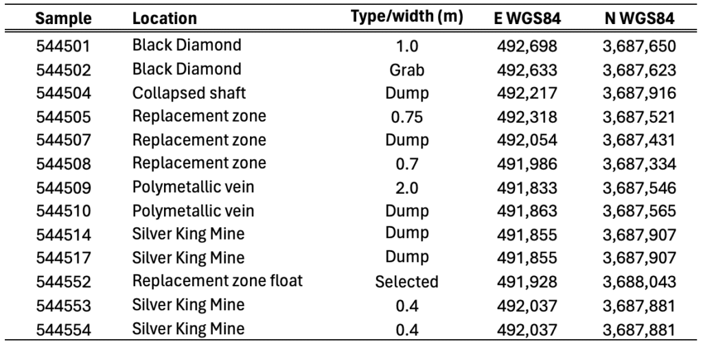 Table 1. Assay results for selected samples from newly identified veins at the Silver King project.