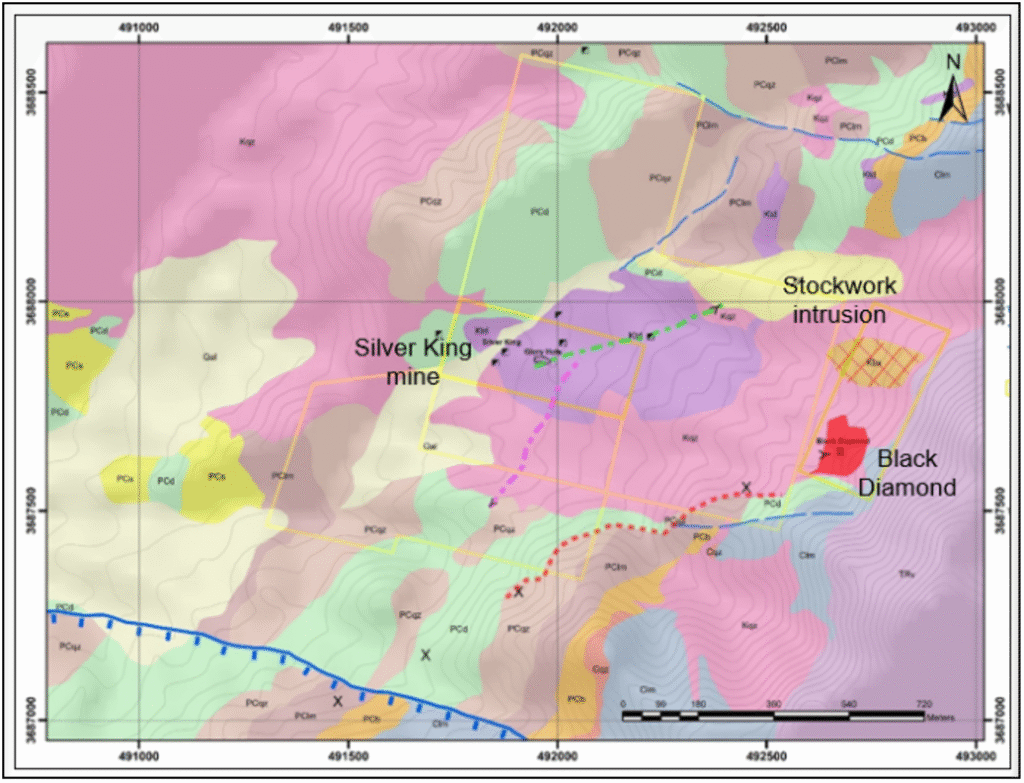 Figure 1. Geologic and land map of the Silver King project showing newly described polymetallic vein in magenta (Ag-Pb-Zn), copper vein in green (Cu-Ag) and stratigraphically controlled replacement mineralization in red. The strongly altered intrusion with stockwork quartz-pyrite veining is indicated by the crosshatch.