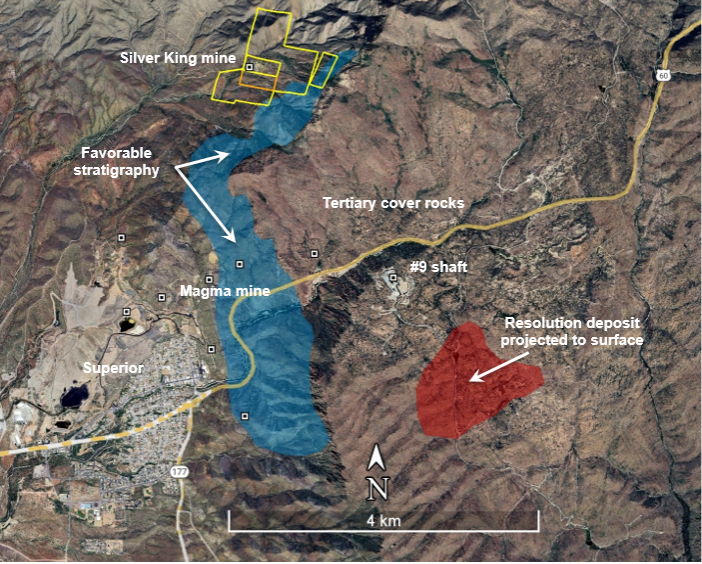 Figure 2. Map showing Silver King project and nearby mineral deposits. The Silver King deposit is located 3km from the Resolution Copper deposit (a joint venture between Rio Tinto and BHP) and the high-grade Magma mine, a former copper and silver producer.