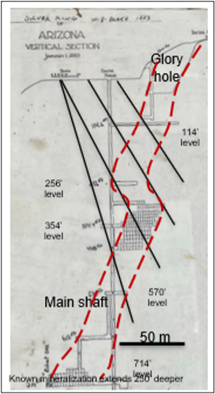 Figure 3. Cross section through the Silver King mine workings showing proposed drill holes (in black) to test the pipelike mineralized body (in red)