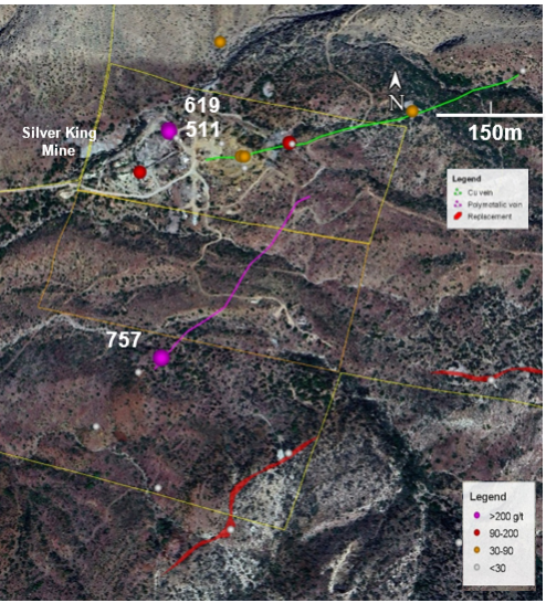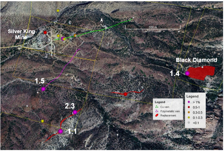 “The overlimit assays for silver highlight the high-grade nature of both the mineralization around the Silver King mine and the recently encountered polymetallic vein. The results confirm the significance of the recently discovered polymetallic vein as a new exploration target at the Silver King project,” said Dr. Craig Gibson, Chief Exploration Officer. “Overlimit copper assays ranging from 1.11% to 2.43% copper for three samples from the replacement mineralization area provides encouraging data for this style of mineralization. The replacement mineralization occurs along strike with the stratigraphic horizon at the nearby Magma mine and occurs as a large body on the Black Diamond claim.”