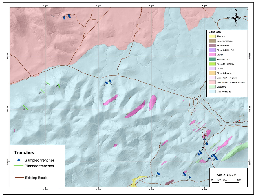 Dr. Craig Gibson, President and CEO commented: “Recent assays from trenches have confirmed that the narrow high grade quartz veins defined in surface sampling at Los Pavitos are hosted by wider mineralized structures. This is important because wider zones of gold mineralization near surface could be important for future development of the property. We are looking forward to exploring these mineralized zones by drilling, planned to commence shortly.”