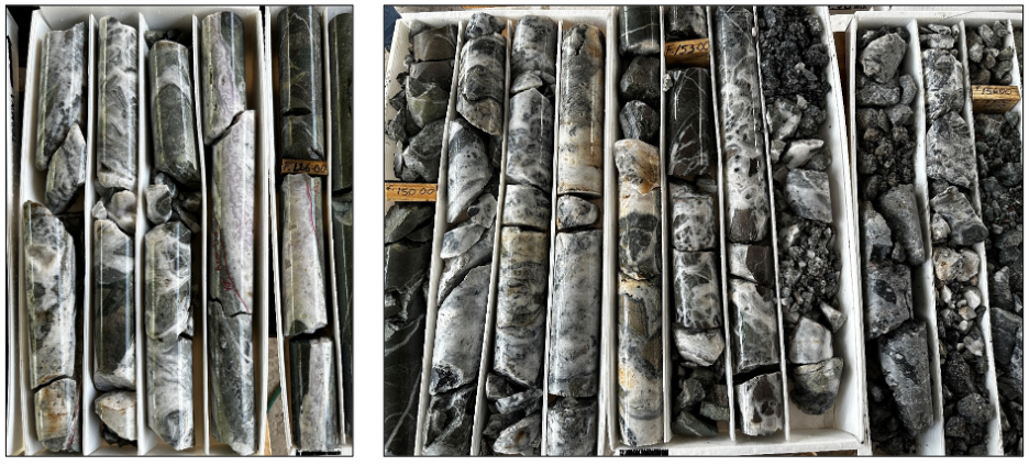 Photos of core from hole PV-23-24 showing multistage vein mineralization with locally abundant sulfide minerals. This hole was drilled in the center of the vein system under holes 2 and 6.