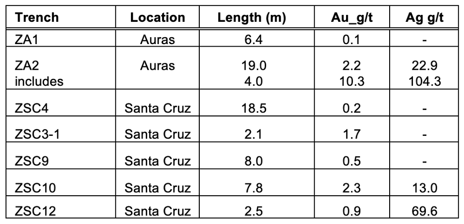 The trenching program across the main mineralized trends on the Los Pavitos property is well underway. Assay results have now been received for 146 samples from a combined length of 309.3 meters in eleven trenches in the Santa Cruz and Las Auras areas. The best assays for individual samples are 20.4 g/t Au and 207 g/t Ag over 2 meters at Las Auras and 16.7 g/t Au and 48,2 g/t Ag over 1 meter at Santa Cruz. The main objective of the trenching program is to define the orientation and full width of the mineralized structures prior to starting the drill campaign. An additional 157 samples for 298.2 meters have been taken from 10 trenches and will be submitted to the lab this week. Approximately 250 meters of trenching remains to be completed.