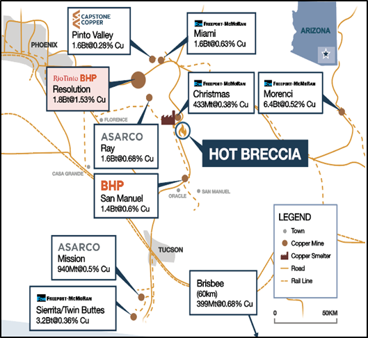 The Hot Breccia project lies at the heart of the Arizona Copper Belt, which hosts several globally significant porphyry copper deposits. Examples of these significant deposits are Freeport McMoRan’s Miami-Inspiration mining complex, BHP’s San Manuel mine, Rio Tinto and BHP’s Resolution deposit and others (see Figure 1).