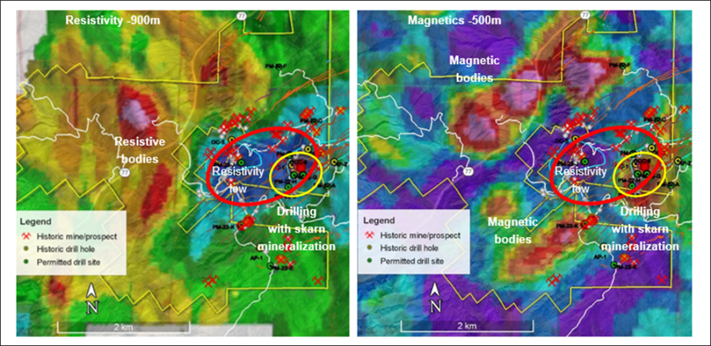 Historical drill holes cut high grade skarn mineralization including 23 meters with 0.54% Cu at 640 meters depth (hole OC-1), 18 m with 1.4% Cu and 4.65% Zn at 830 meters depth (hole OCC-7), and 7.6 m with 1.73% Cu and 0.11% Zn at 703 meters and 4.6 meters with 1.4% Cu and 0.88% Zn at 716 meters (OCC-8). Mineralization occurs within a several hundred-meter-thick altered zone hosted in favorable Paleozoic carbonate rocks that underly a sequence of Cretaceous andesitic volcanic rocks. These carbonates are the same rocks that host the high-grade copper mineralization at Freeport’s nearly Christmas mine. The historic drilling intersected a blind mineralized intrusion associated with the skarn mineralization, providing an immediate drill target that is believed to be the source of the mineralization at Hot Breccia (Figure 3). Several magnetic highs in the region surrounding the proposed intrusion may also indicated buried skarn mineralization and provide additional exploration targets.