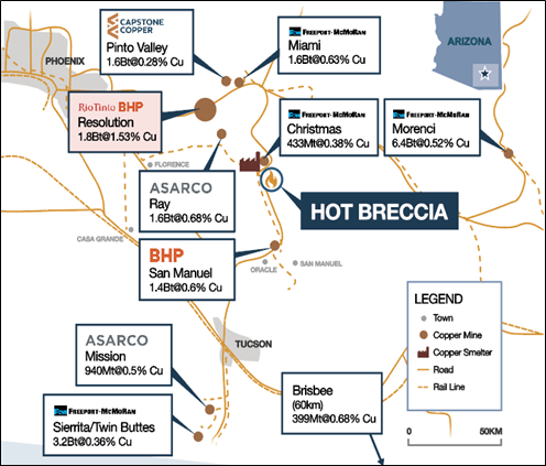 Prismo’s Hot Breccia project lies at the heart of the Arizona Copper Belt, which hosts several globally significant porphyry coppers. Examples of these significant deposits are Freeport McMoRan’s Miami-Inspiration mining complex, BHP’s San Manuel mine, Rio Tinto and BHP’s Resolution deposit and others (see Figure 2).